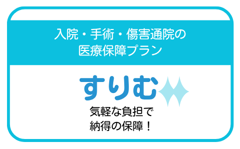| 入院・手術保険金 | 1回の入院につき90日(すりむは60日)まで保障します。 同じ病気・ケガなら1回の入院で90日(すりむプランは60日)まで、 同一保険期間内の支払限度額は80万円まで保障。 手術は医科診療報酬点数1,000点以上が対象、点数により入院保険金日額の1、5、10、20倍を保障。 |